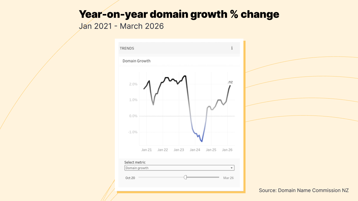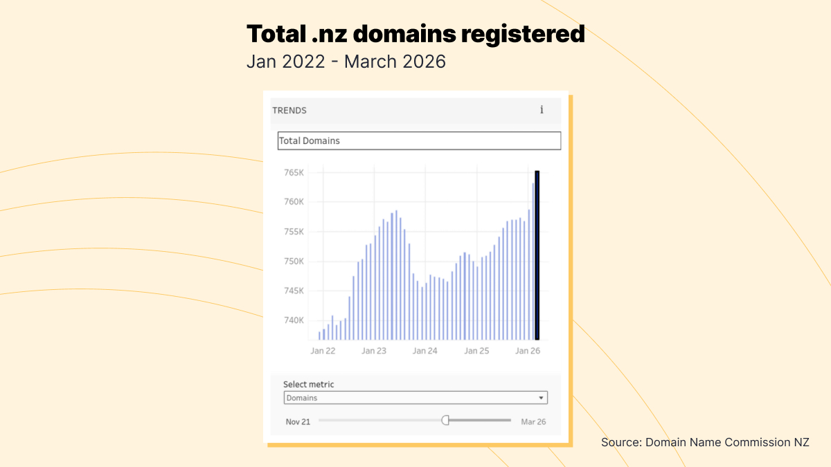 By the end of March there were 764,987 .nz domains registered, a new record. Prior to 2026, the record sat at 758,493 (from 2023). That record has been well and truly left in the dust.
