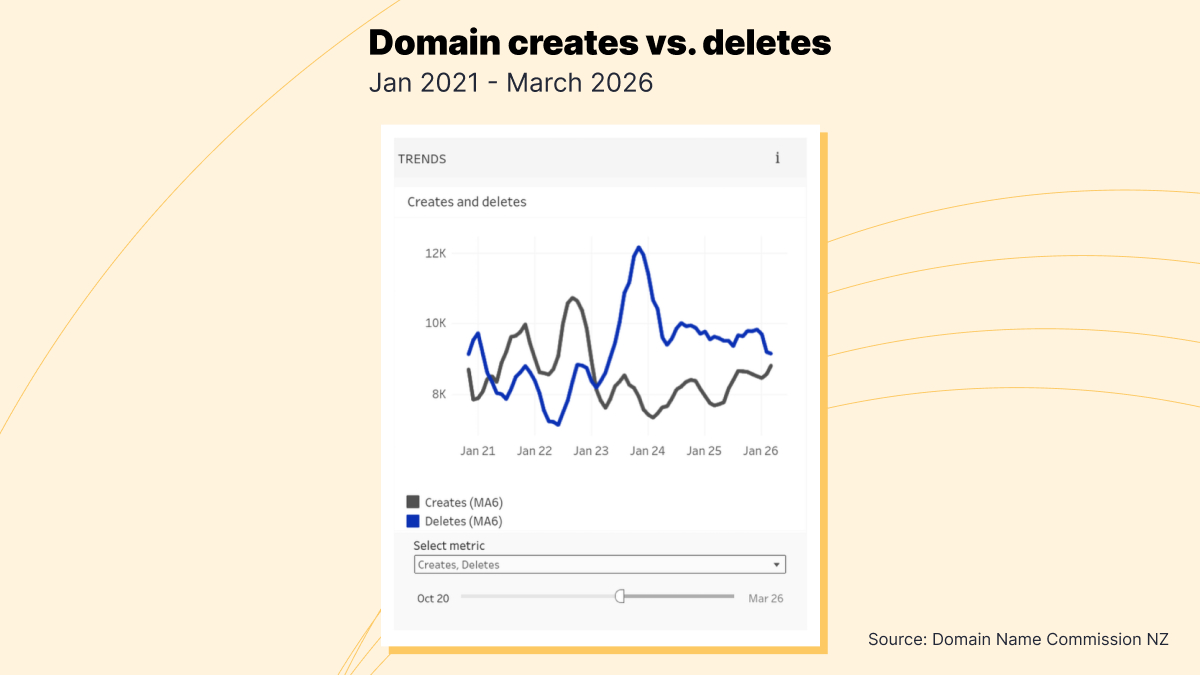 Thanks to data from InternetNZ we can see the pure amount of creates and deletes in any given month, without any 6-month averaging. As we observed earlier, there were significantly more new domains created and a big drop in deletes in February, followed by another big rise of creates again in March.