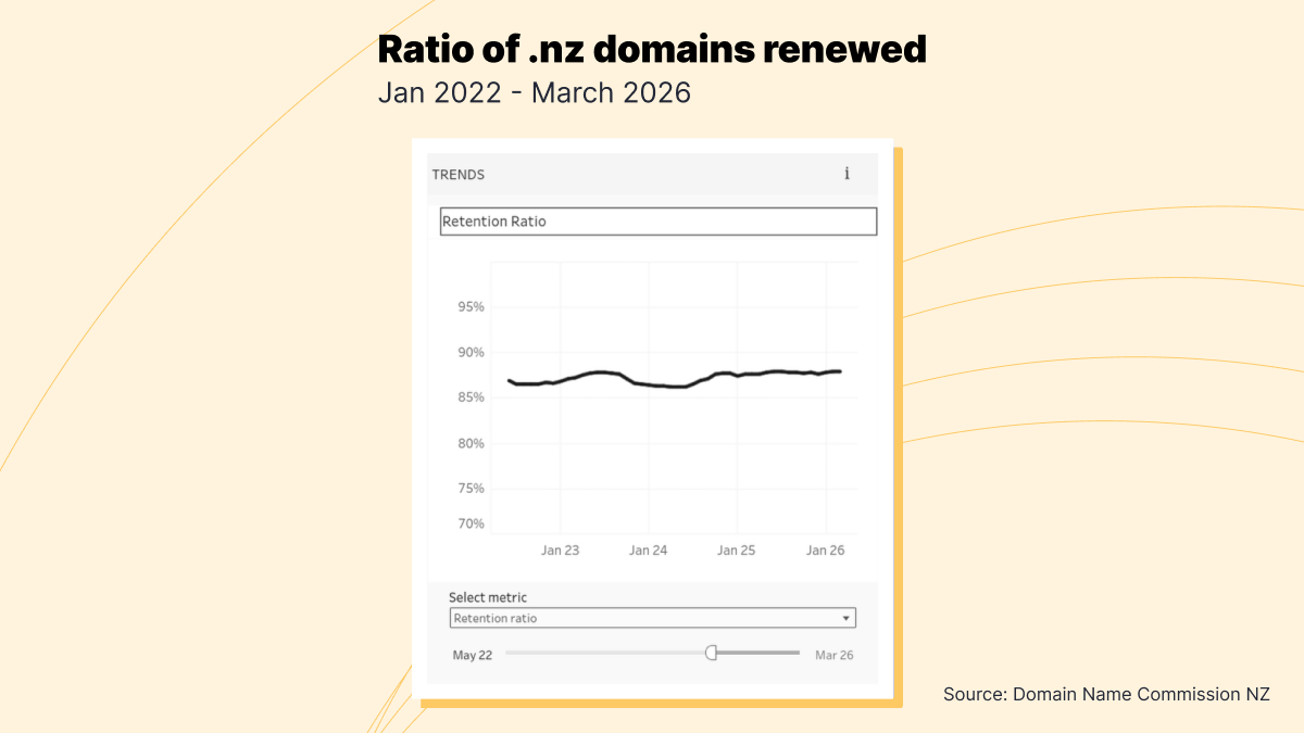 From mid-2022 to 2024, .nz domain renewal rates looked to be dropping. Since then it’s hovered between 83% and 86%. Our last reporting on renewal rates was a bit gloomy, noting that the renewal rate was a drag on growth. It still is, and after another dip in November/December (an annual trend at this point) renewal rates are pretty much exactly where they were in September last year: 85.4%. It seems renewal rates are steadying at that ~85% mark.